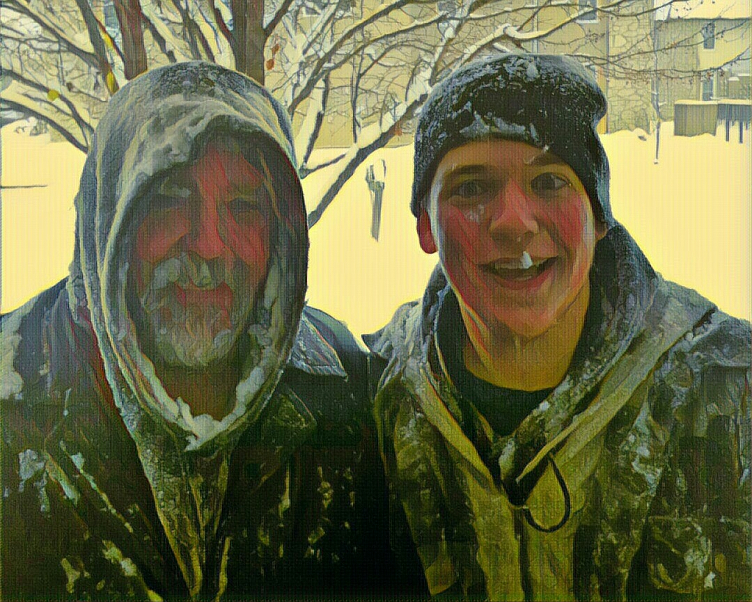 My wife poked her head out the door and snapped a picture of us a few minutes before we began the twenty-minute process of brushing the snow from our clothes and going back inside.