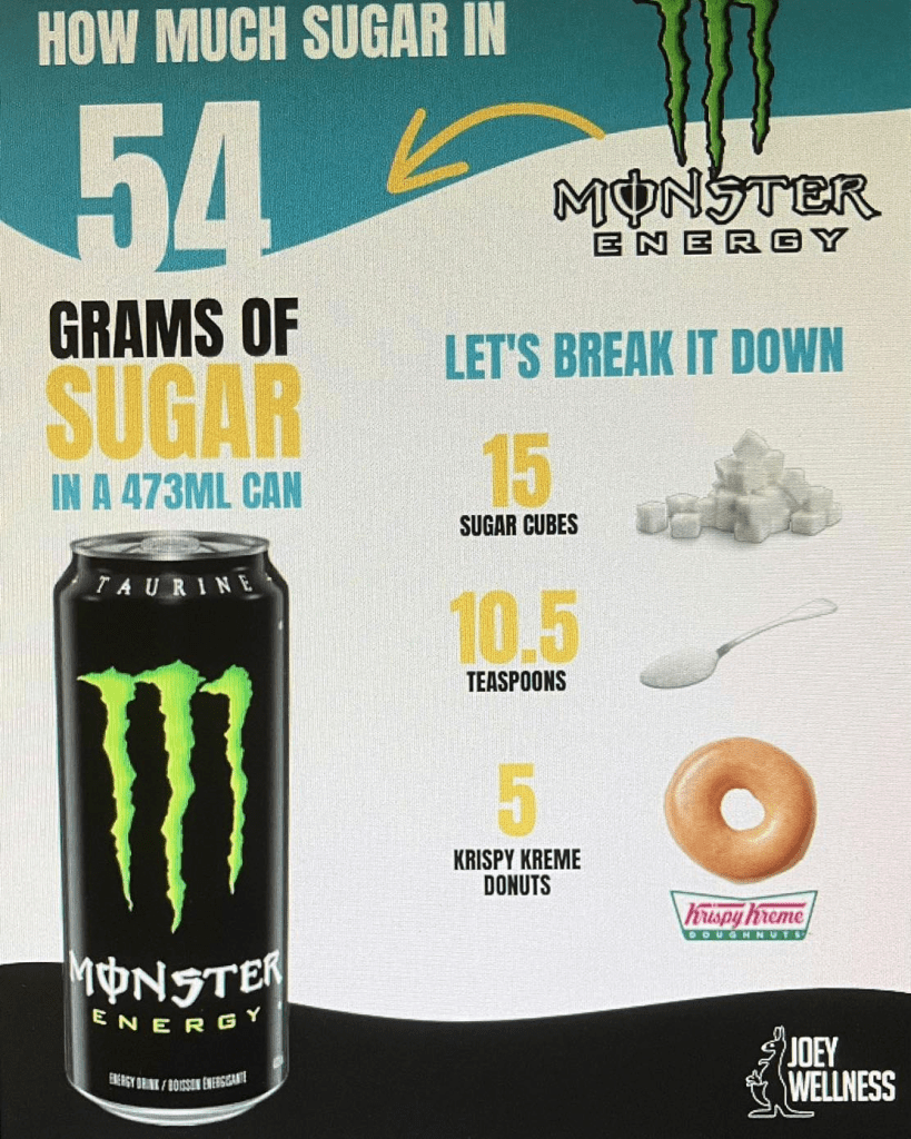 That’s right, ONE can of regular Monster energy has the same amount of sugar as FIVE Krispy Kreme donuts! If I were eating the same amount of sugar in donuts as I was drinking in soda and energy drinks, I was shocked to realize I was consuming the equivalent of at least a dozen donuts a day!